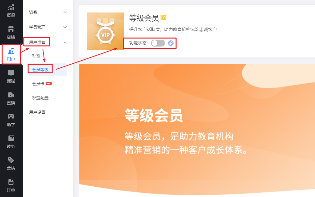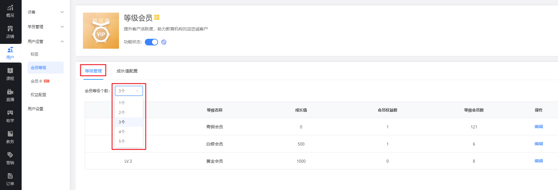在管理后台【用户-用户运营-会员等级】中开启功能。