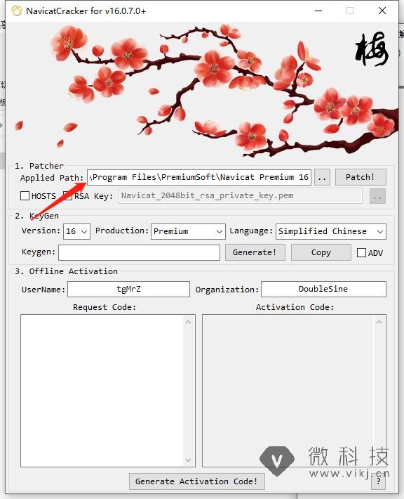 将 Navicat 给的请求码复制到注册机 Request Code 中