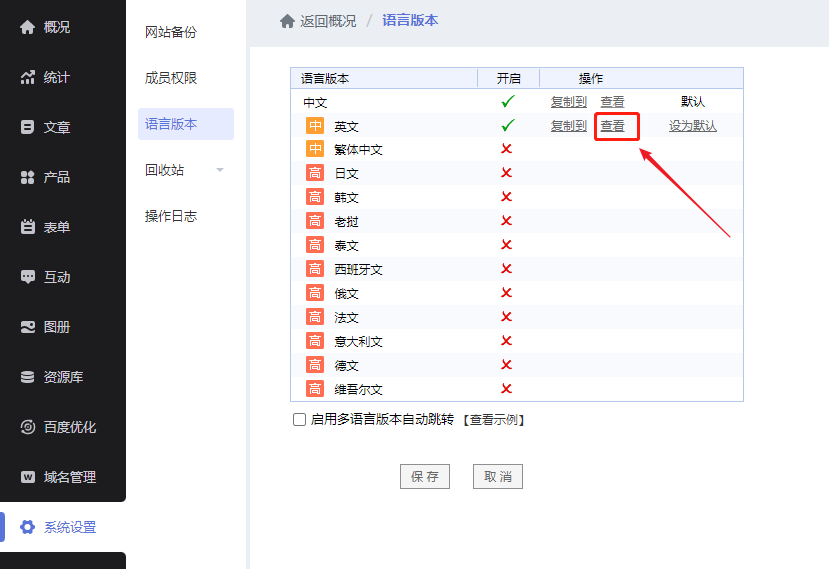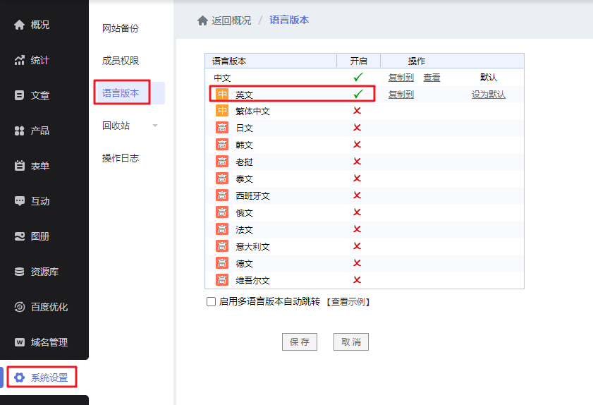 登陆网站管理后台,点击【系统设置-语言版本】,勾选开启【英文】语言版本然后保存,即开通英文版网站框架。
