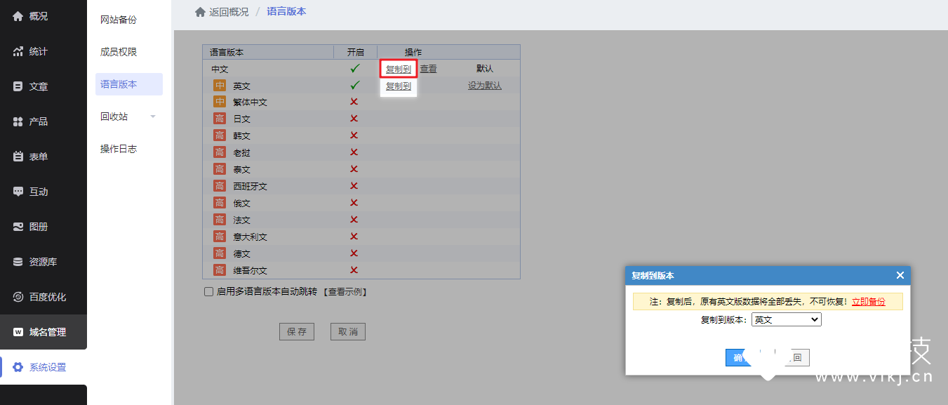 点击中文版【复制到】,可将中文版的内容复制到其他语言版本。选择英文版本,点击确定,即可将中文版内容复制到英文版,原来英文版内容将全部丢失(建议提前备份),会被替换成中文版的内容。这样的好处是:如果您已经搭建好中文版的网站内容,可直接将中文版内容复制到英文版,然后修改英文版的文字为英文即可,无需重复搭建,可节省搭建时间。