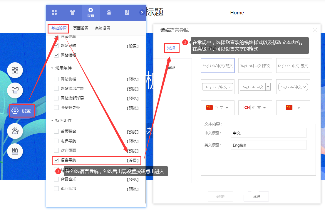 4.1. 在设计页面中,点击左侧【设置-基础设置-特色组件】按钮,将【语言导航】勾选开启,开启后点击【设置】按钮选择语言导航的样式。