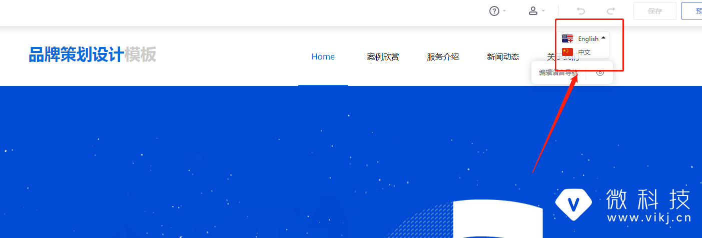 3.1 语言版本的设计过程的操作都是跟中文版的一样的。点击英文版的【查看】按钮,可进入英文版网站设计页面。进入后,将其中的中文文字修改为英文即可,