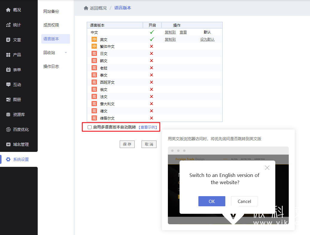 在在网站管理后台【系统设置-语言版本】中,将底部【启用多语言版本自动跳转】勾选开启。开启后,当用户用英文版浏览器访问时,将优先询问是否跳转到英文版。