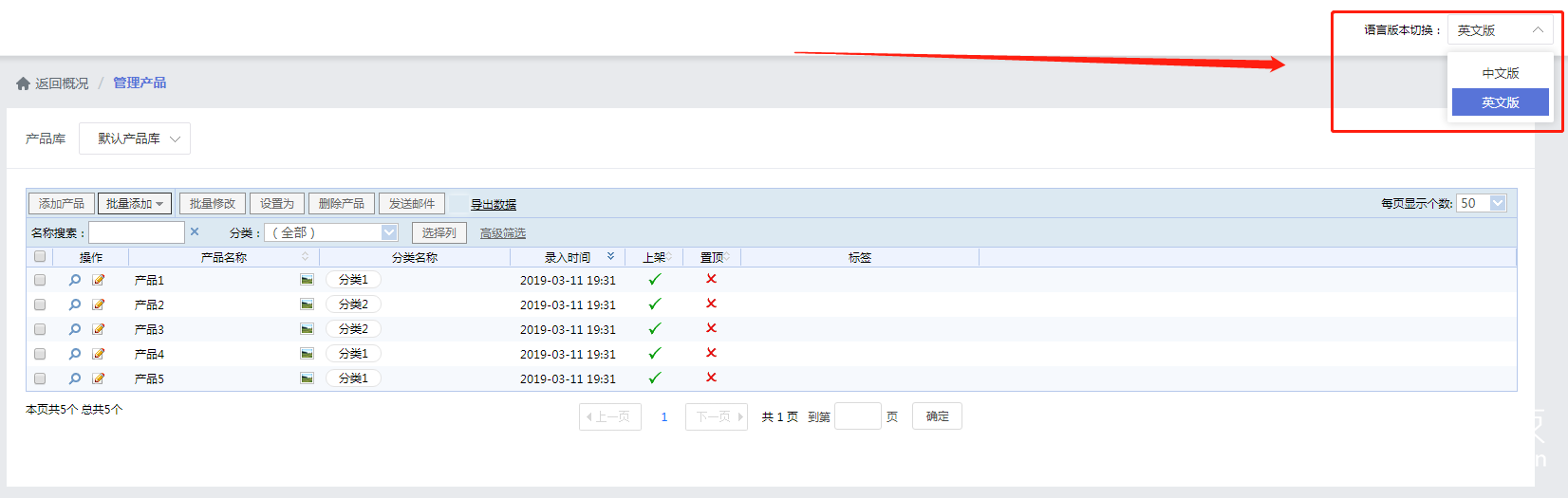 (注意:语言版本仅针对系统文字,自己添加的内容是根据添加输入的内容直接展示的。例如在英文版网站添加一篇文章,文章用中文编辑的,那么显示出来也是中文,不会自动把文章转换成英文)