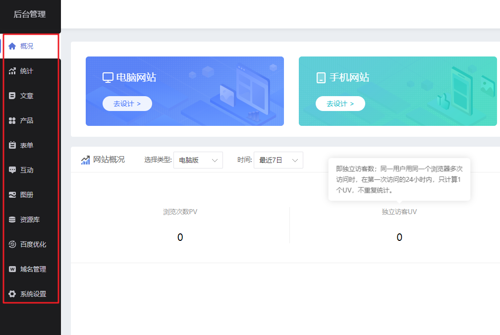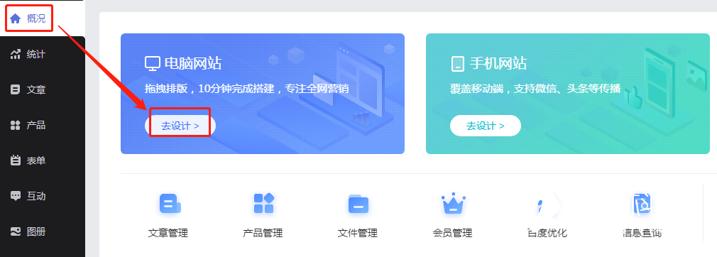 在建站管理后台【概况】中点击电脑网站【去设计】。