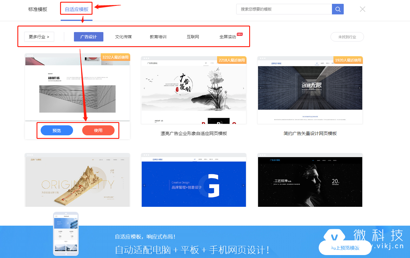 1.4 进入极速建站页面后,点击左上角的【自适应模板】,然后选择行业,挑选喜欢的模板进行【预览/使用】。
