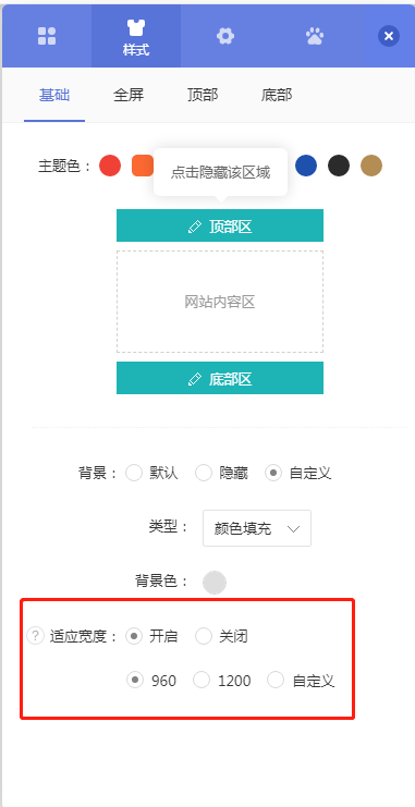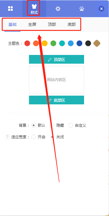 本教程分别介绍自适应模板网站的样式:【基础】、【全屏】、【顶部】和【底部】的应用。