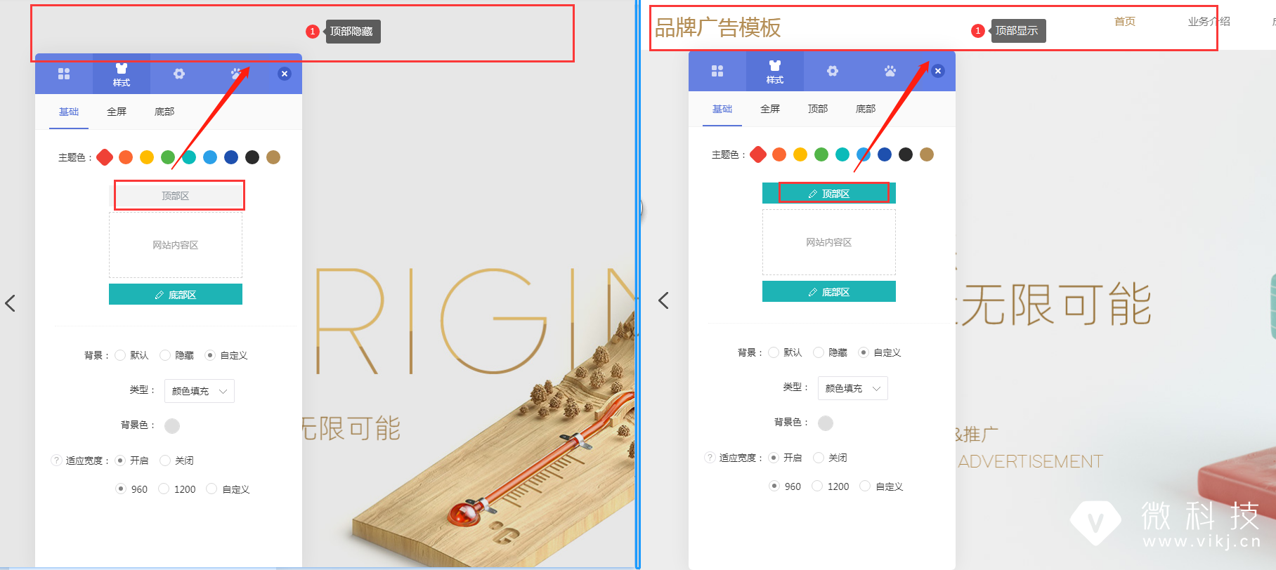 支持单独隐藏顶部或底部区,不受传统网站样式限制,让您的网站更加有个性。当按钮显示为绿色时表示该区域为显示状态。显示灰色为隐藏该区域。