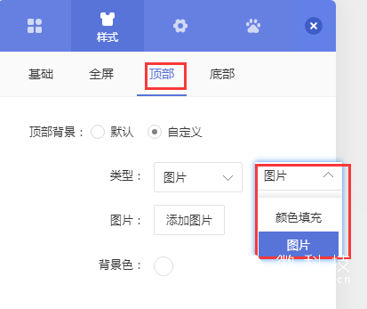 顶部设置需要在【步骤 1 基础】中有设置显示才会出现哦,如设置隐藏则无需设置顶部背景。