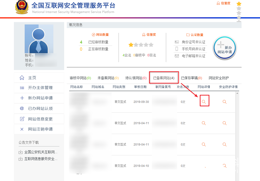 1.2 在【已备案网站】中点击查看网站域名后的【网站详情】。