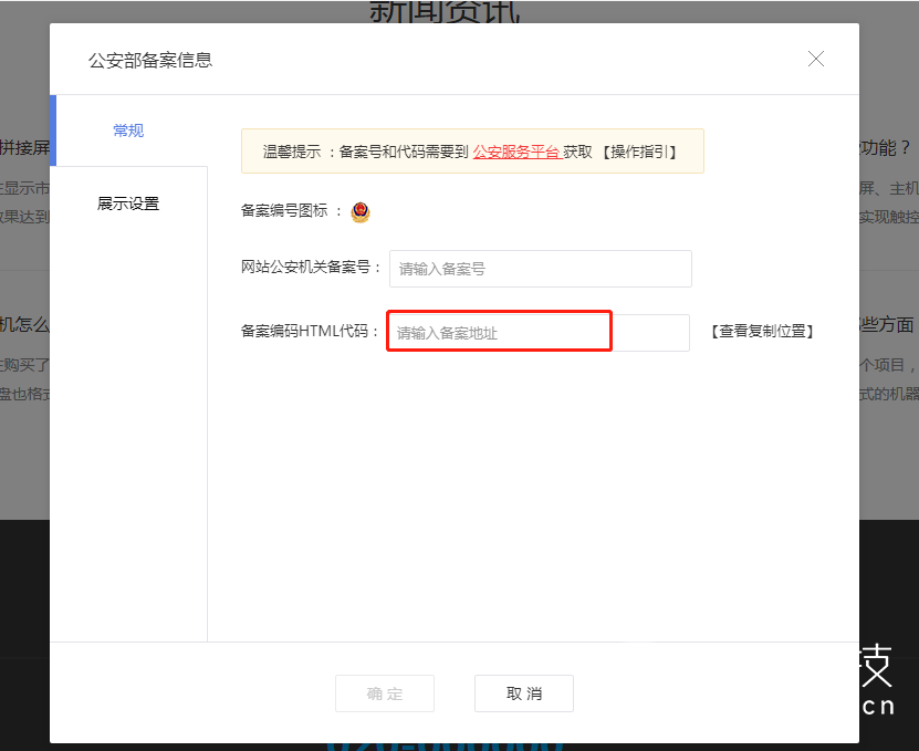 ② 将复制的备案号粘贴到【网站公安机关备案号】一栏。