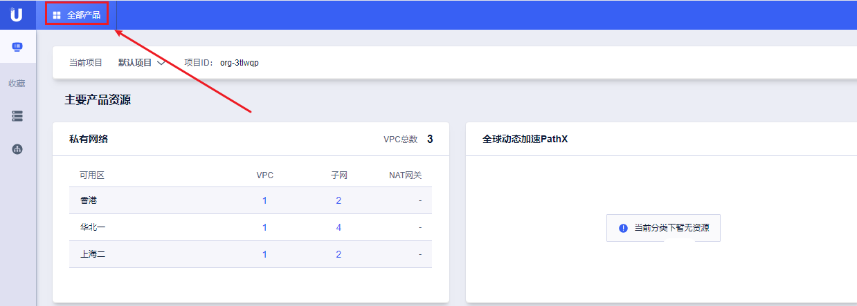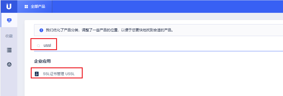 1.3 登录UCloud后进入到控制台中,点击左上角【全部产品】,在搜索框中输入“ussl”进行搜索,点击搜索结果的“证书管理USSL”。