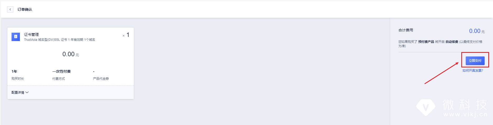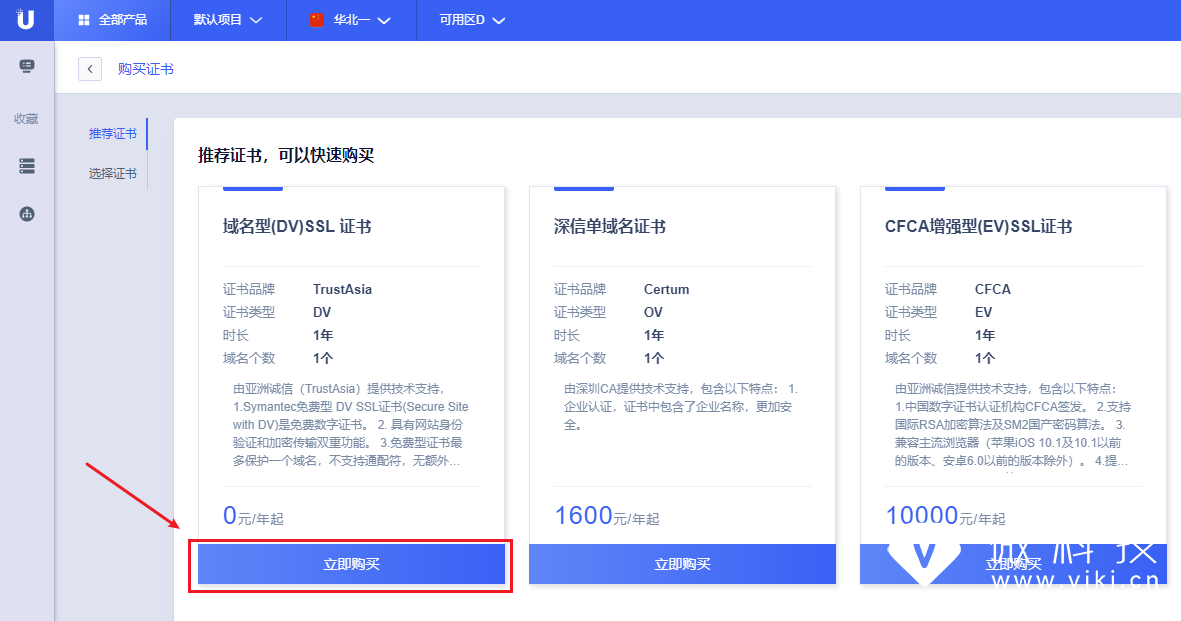 1.3 点击后进入购买证书页面,点击【免费证书-购买证书】。