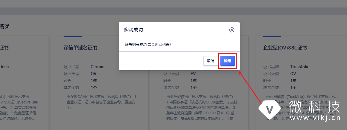 1.5 证书购买后点击弹窗【确认】按钮返回列表。