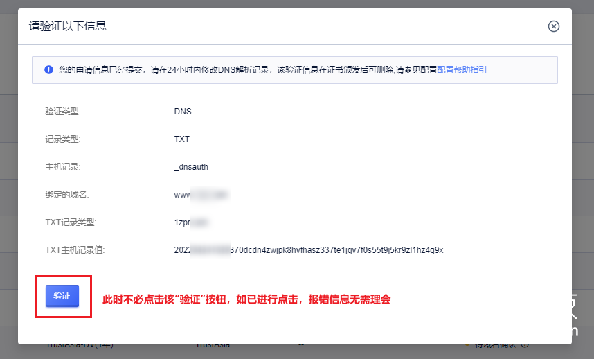 1.9 弹窗信息在步骤【2.域名添加证书记录】中需要使用,无需关闭。