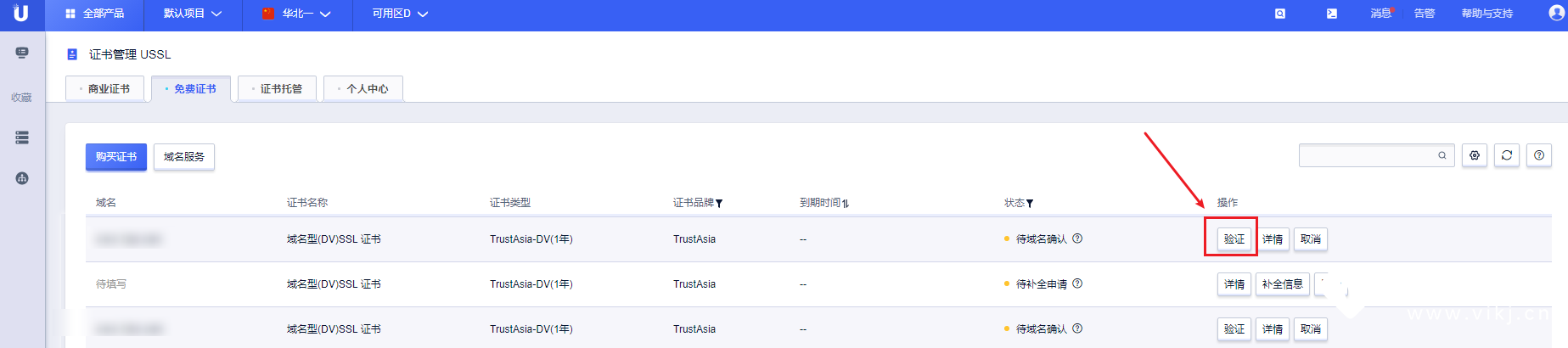 1.8 资料全部填写完并保存后,在证书列表点击【验证】按钮进行获取TXT主机记录值,在后面操作中需要进行域名解析。