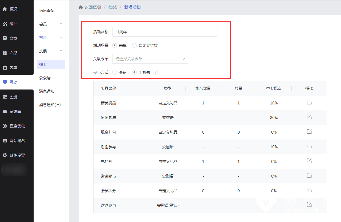 ① 奖品默认8个奖品名称,需要单独编辑。点击操作按钮即可进入编辑奖品页面。支持多种四种奖品类型(使用表单手机号参与方式的,不支持会员积分奖品类型的设置)