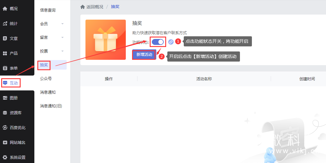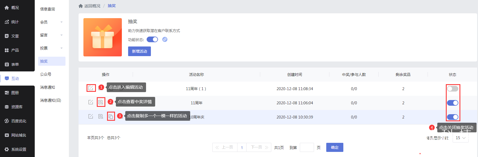 在管理后台【互动-抽奖】中开启功能,点击【新增活动】创建抽奖活动。