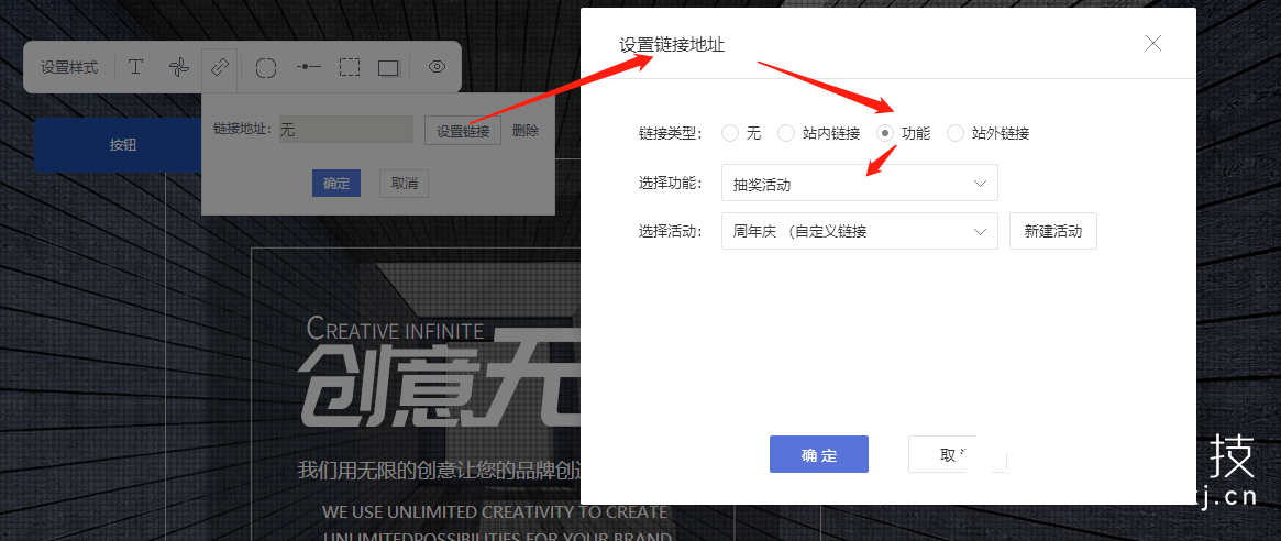 ③ 如果活动场景选择自定义链接后,在设计器内可通过【设置链接】-【功能】-【抽奖活动】选择具体的活动,直接让想抽奖的新用户成为会员。未登录用户点击抽奖时跳转注册页,注册完后即可参与。