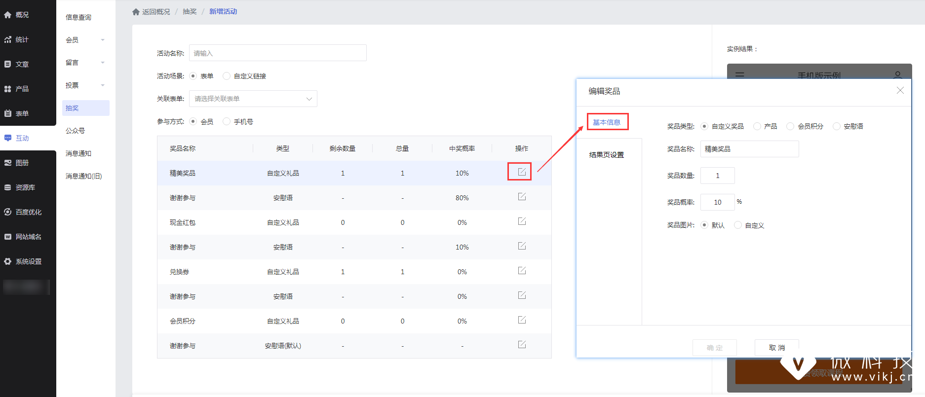 ② 活动奖品设置,对应具体奖品点击编辑,可设置基本信息,同时可对应具体奖品的结果页进行二次编辑。