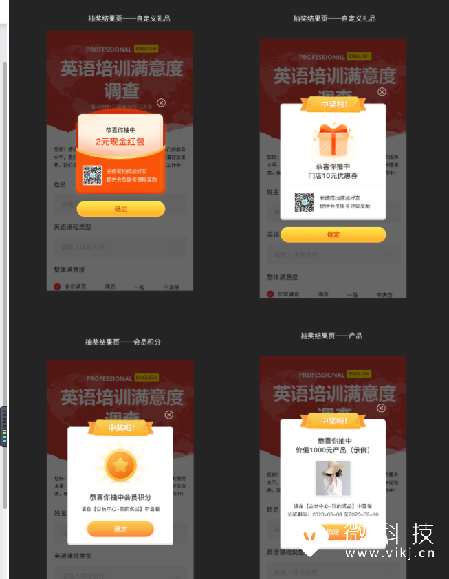 -自定义礼品:方便配合线下场景,可填写奖券号、现金红包等,在结果页可提供微信二维码、门店地址、联系方式给用户