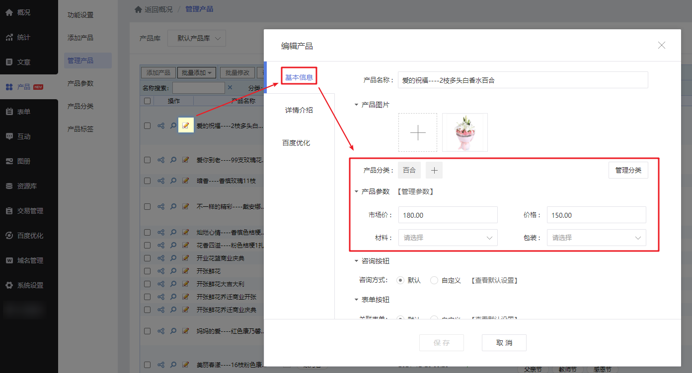 设置产品甄选效果前,我需要先给产品设置产品分类和产品参数。在管理后台页面【产品-管理产品】,页面产品编辑按钮,给产品独立设置“产品分类”和“产品参数”。