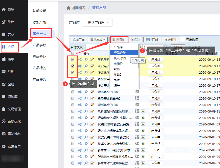 您也能批量键入产品展开设置“产品分类”和“产品参数”。