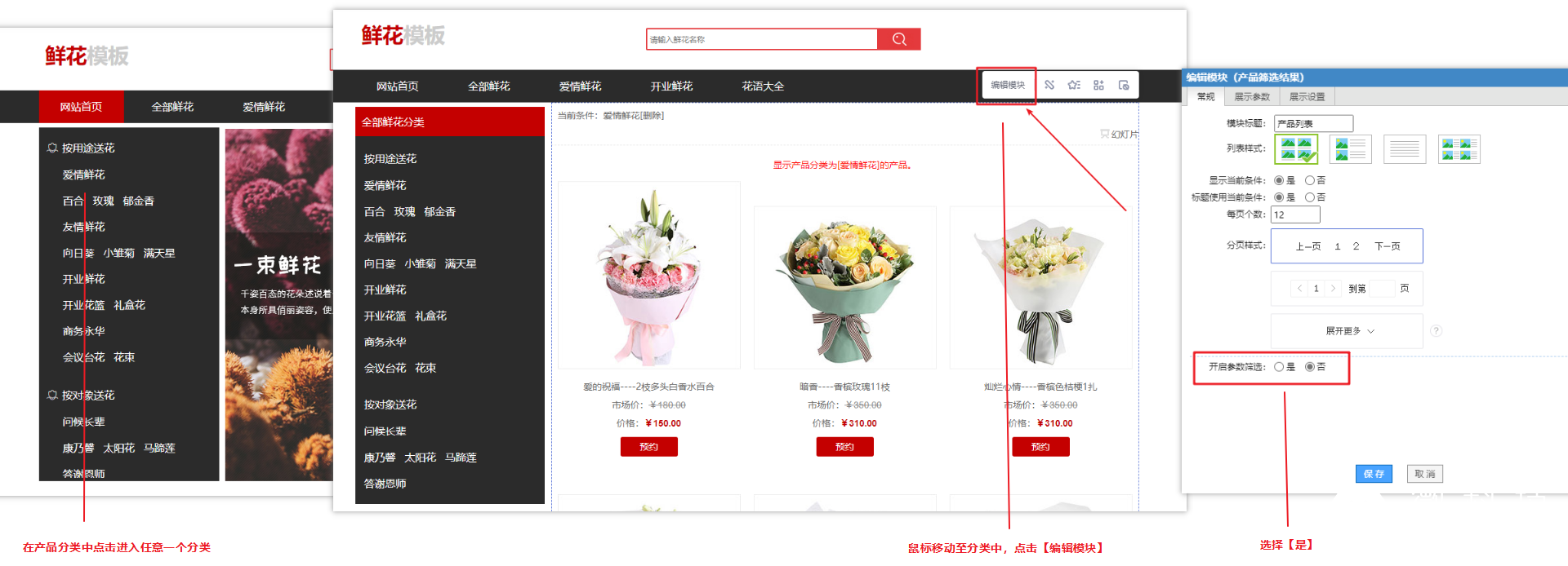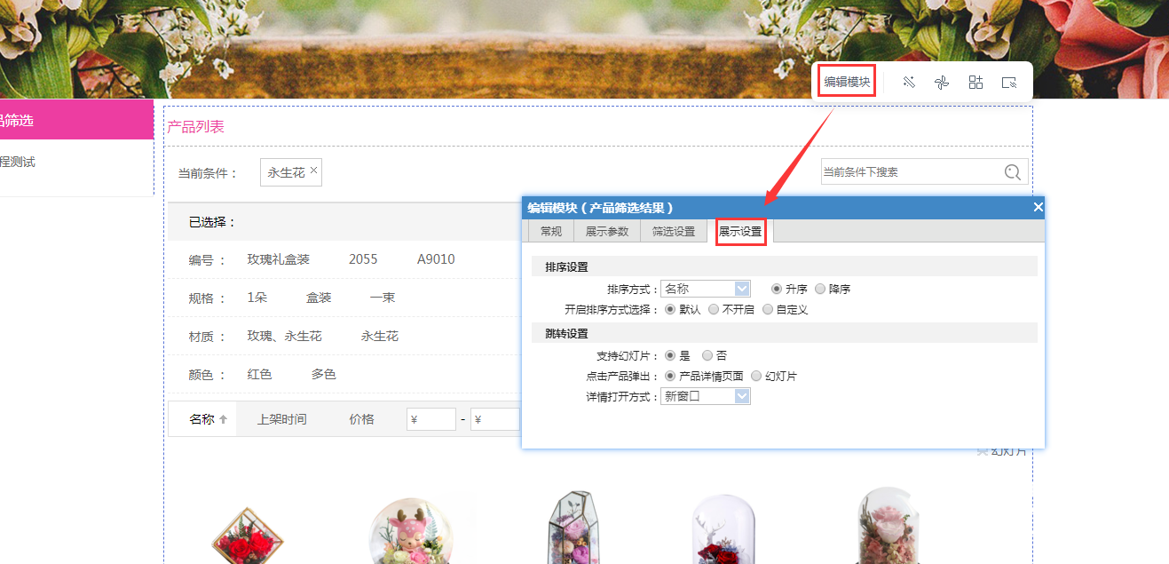 后的【展现设置】中,您能给产品甄选模块展开排序,重定向的设置,根据您的实际情况设置就可以。