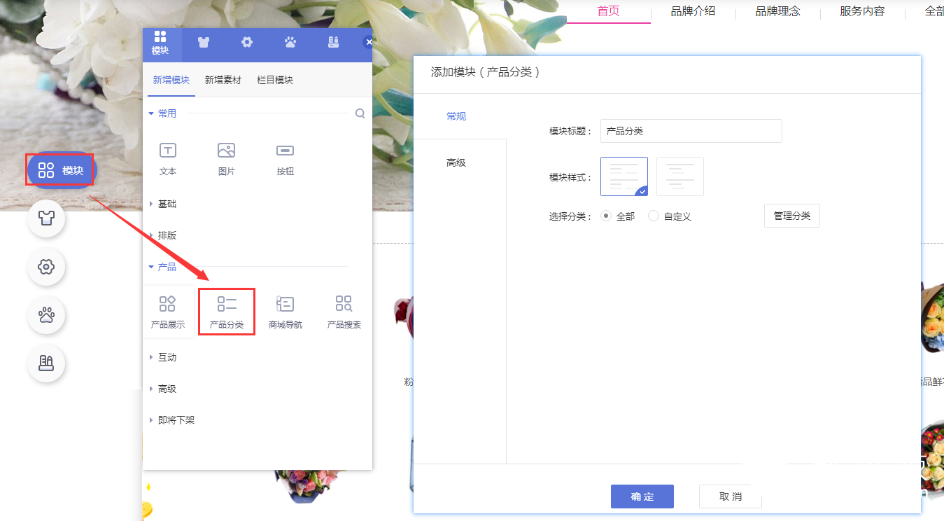 在设计页面页面【模块-追加模块-产品】嵌入【产品分类】模块。