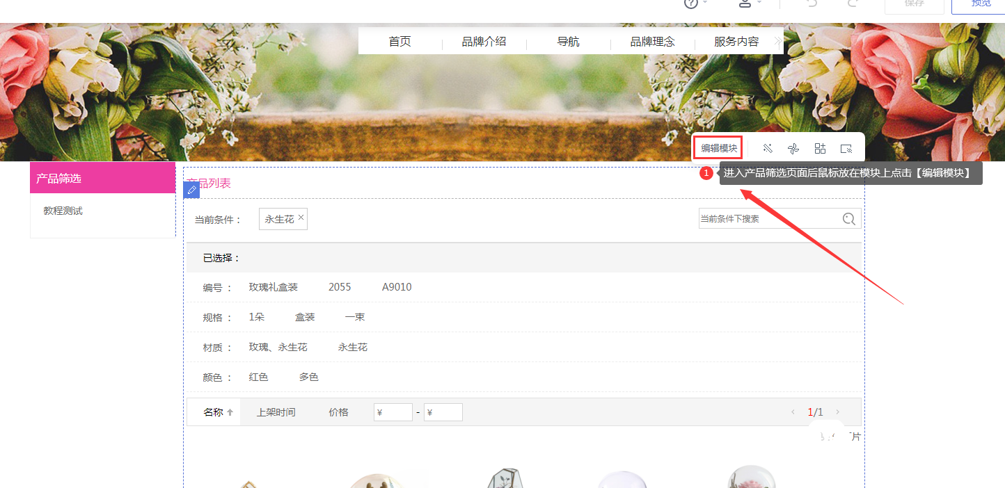 在产品甄选结果页面,鼠标放到模块上,出现【编辑模块】按钮时页面步入。