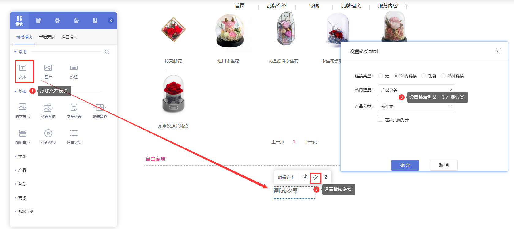 嵌入任一能设置链接的模块,比如【图片】【文本】等模块。页面设置重定向链接,将链接设置到产品分类或者其它设置了产品甄选的页面。