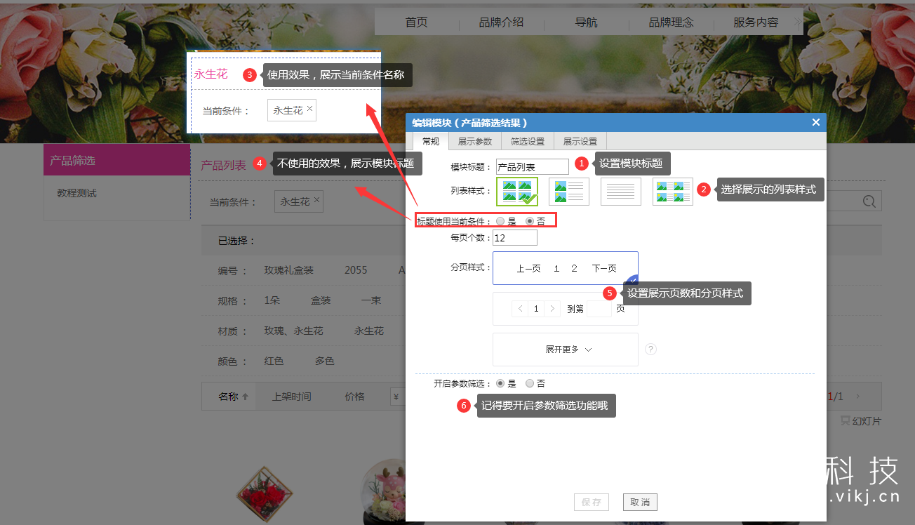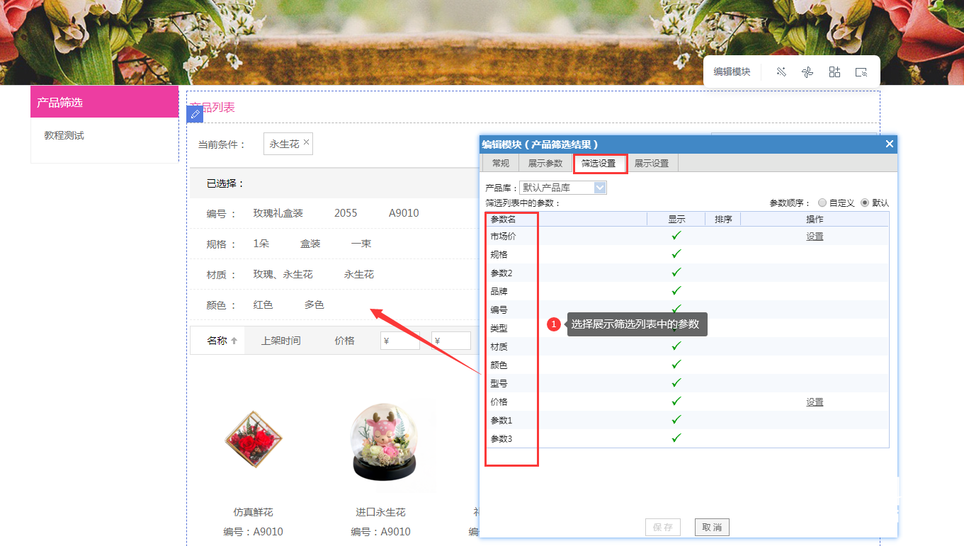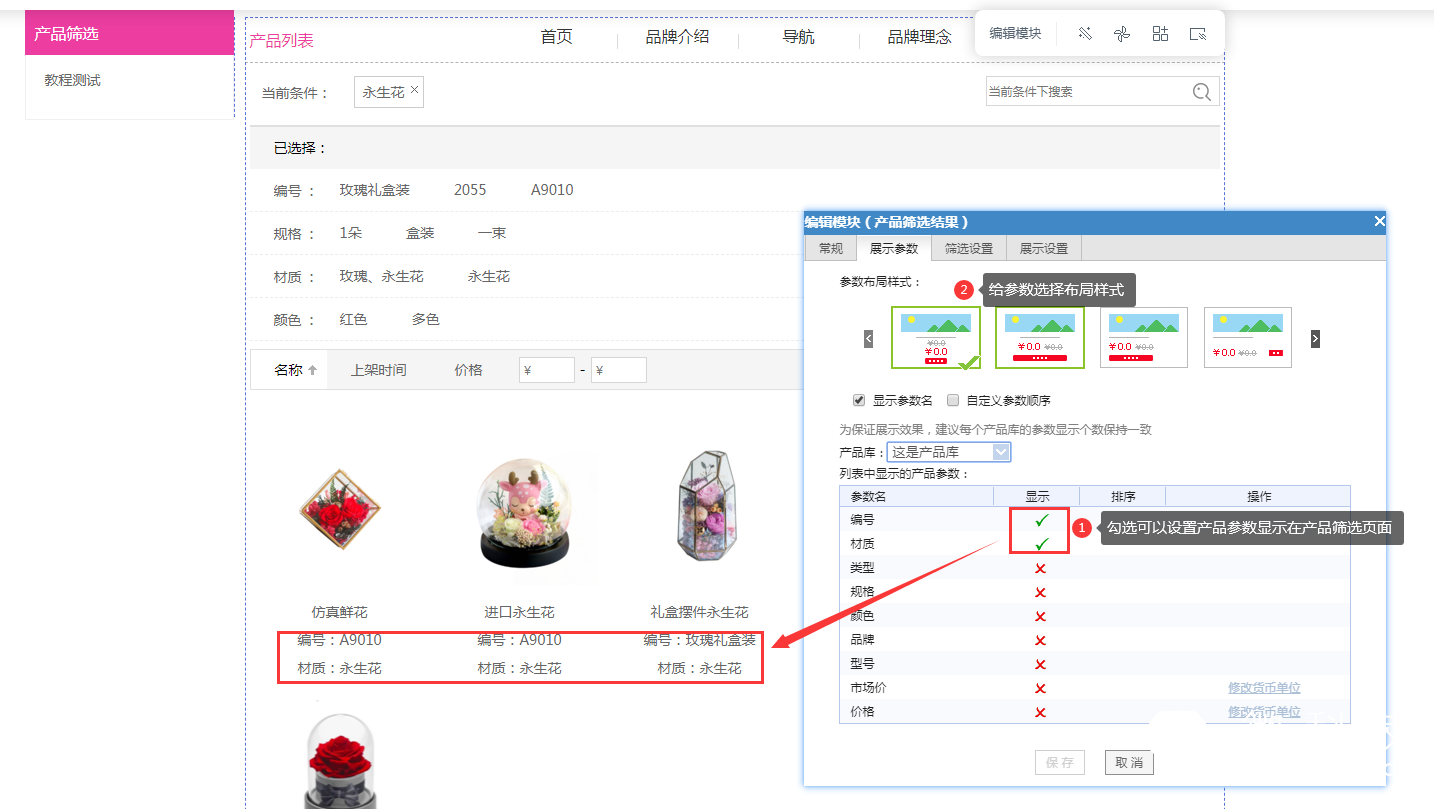 在【展现参数】中选择参数布局样式和设置甄选页面产品是否展现产品参数和展现的产品参数项。