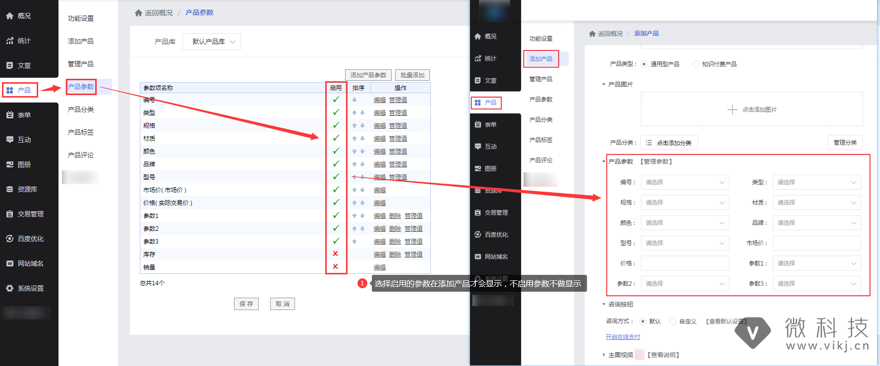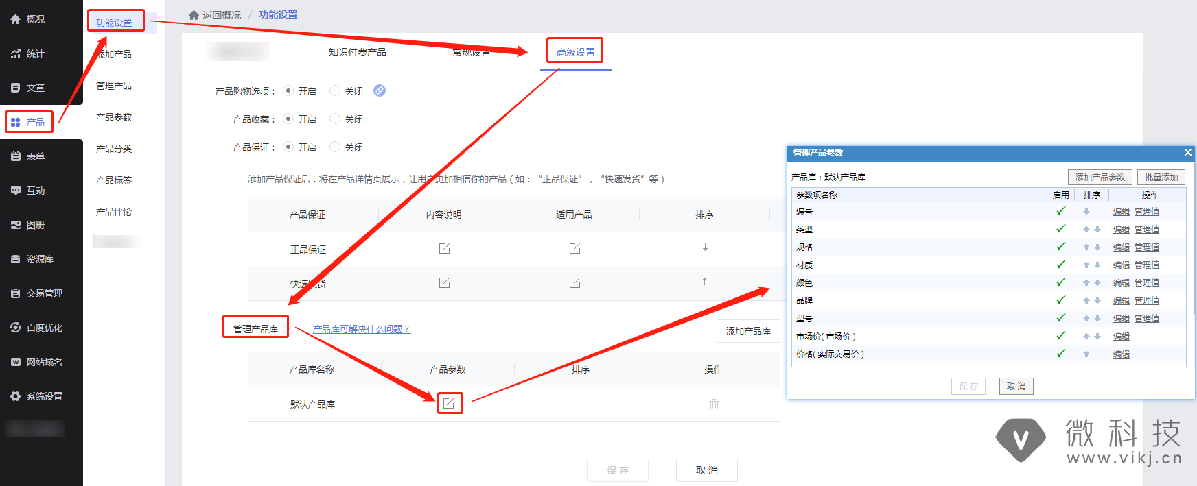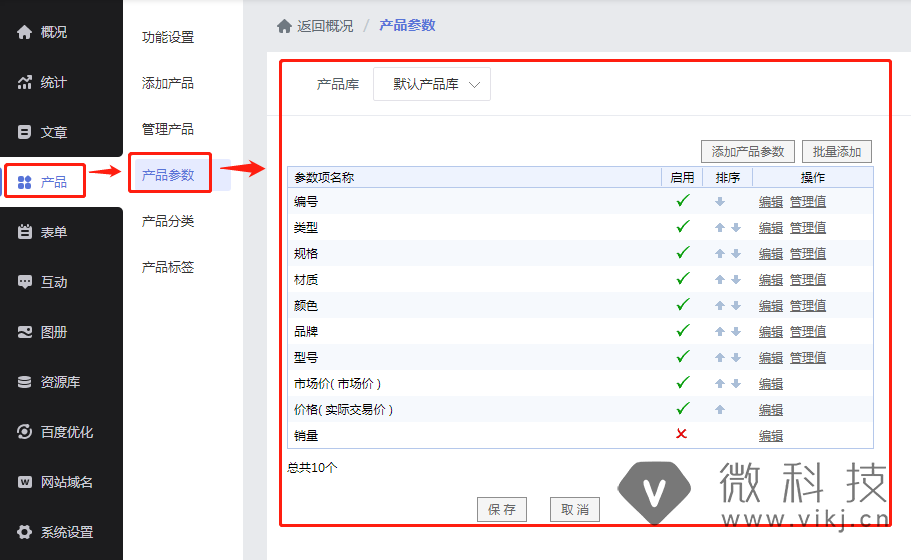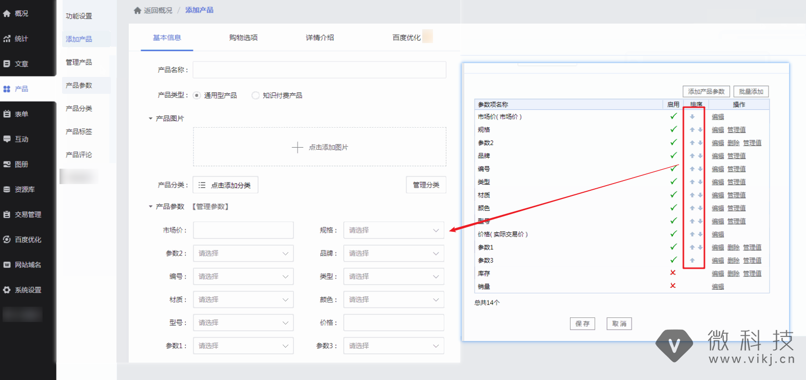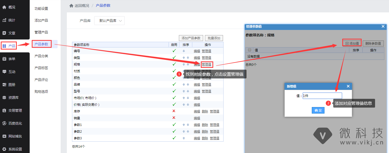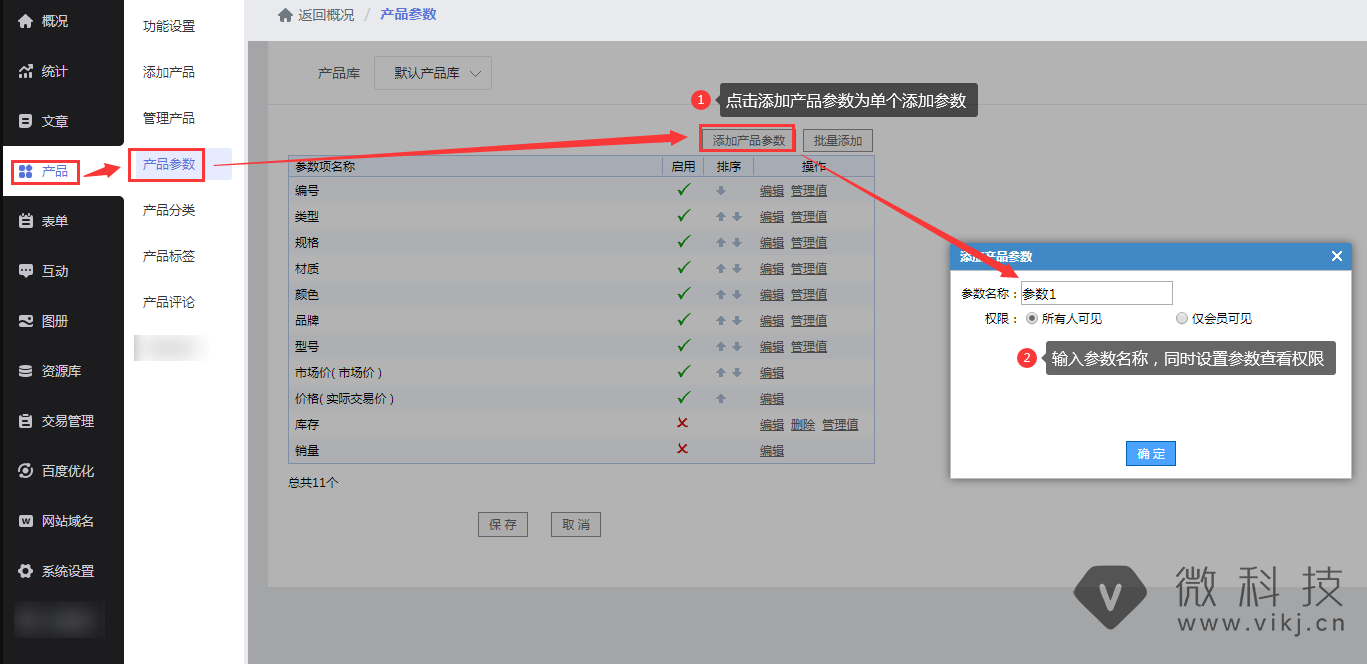 1.1 步入网站管理后台,页面【产品-产品参数】步入管理。