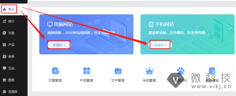2.1 在管理后台页面【概况】步入电脑版/手机版设计页面。