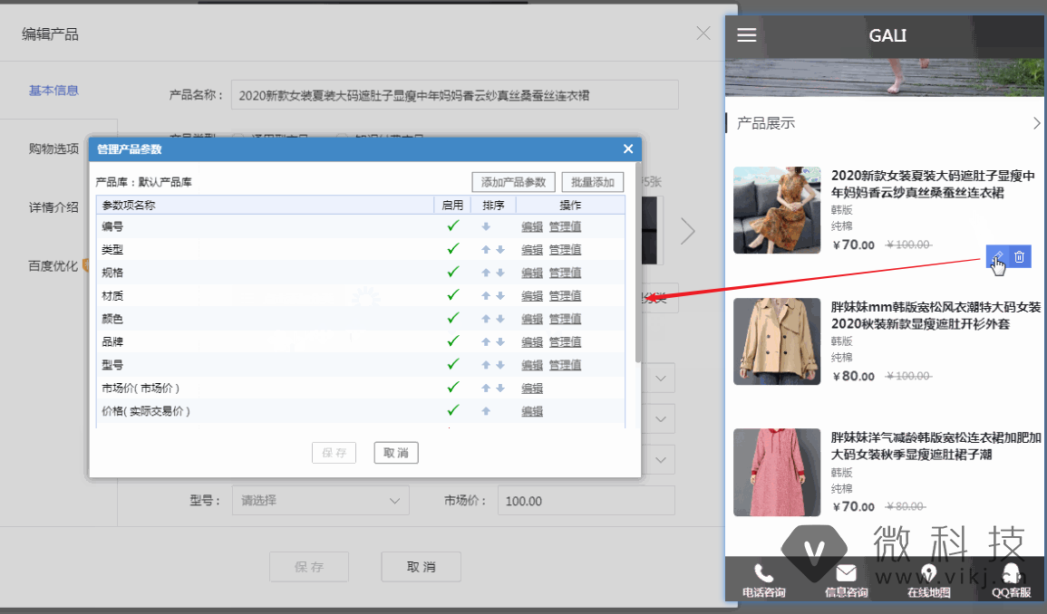 步入手机版设计页面,鼠标移动到产品展现模块上的产品边线,发生编辑按钮时页面步入编辑产品页面,展开管理参数。、