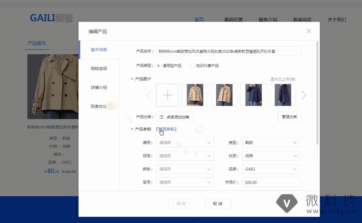步入电脑版设计页面,鼠标移动到产品展现模块上的产品边线,发生编辑按钮时页面步入编辑产品页面,展开管理参数。如下图:
