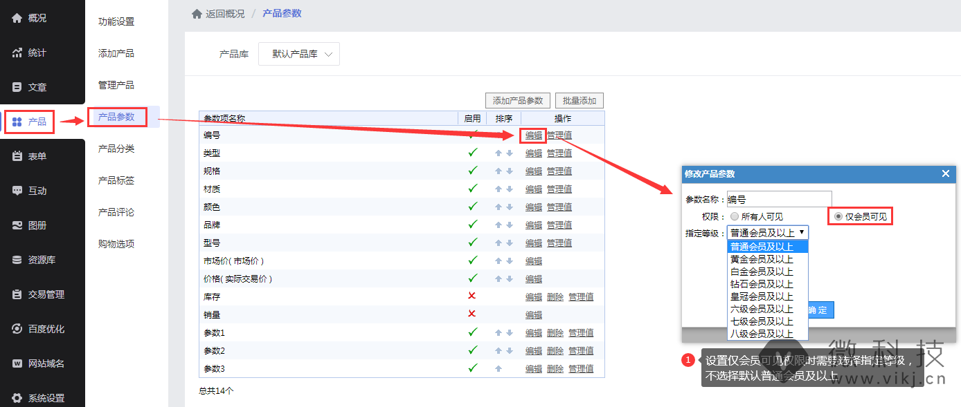 ① 单个嵌入产品参数:步入管理后台【产品-产品参数】页面【嵌入产品参数】展开单个参数的嵌入。参数权限如不可以选择预设为所有人可知。如可以选择为仅会员可知时须要设置好对应会员等级,不设置预设普通会员及以上。