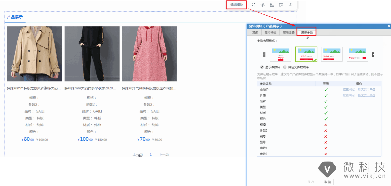 在电脑版设计页面,找出产品展现模块,将鼠标放到模块上,发生【编辑模块】按钮时页面,在【展现参数】中即将设置表明的产品参数展开页面打开。
