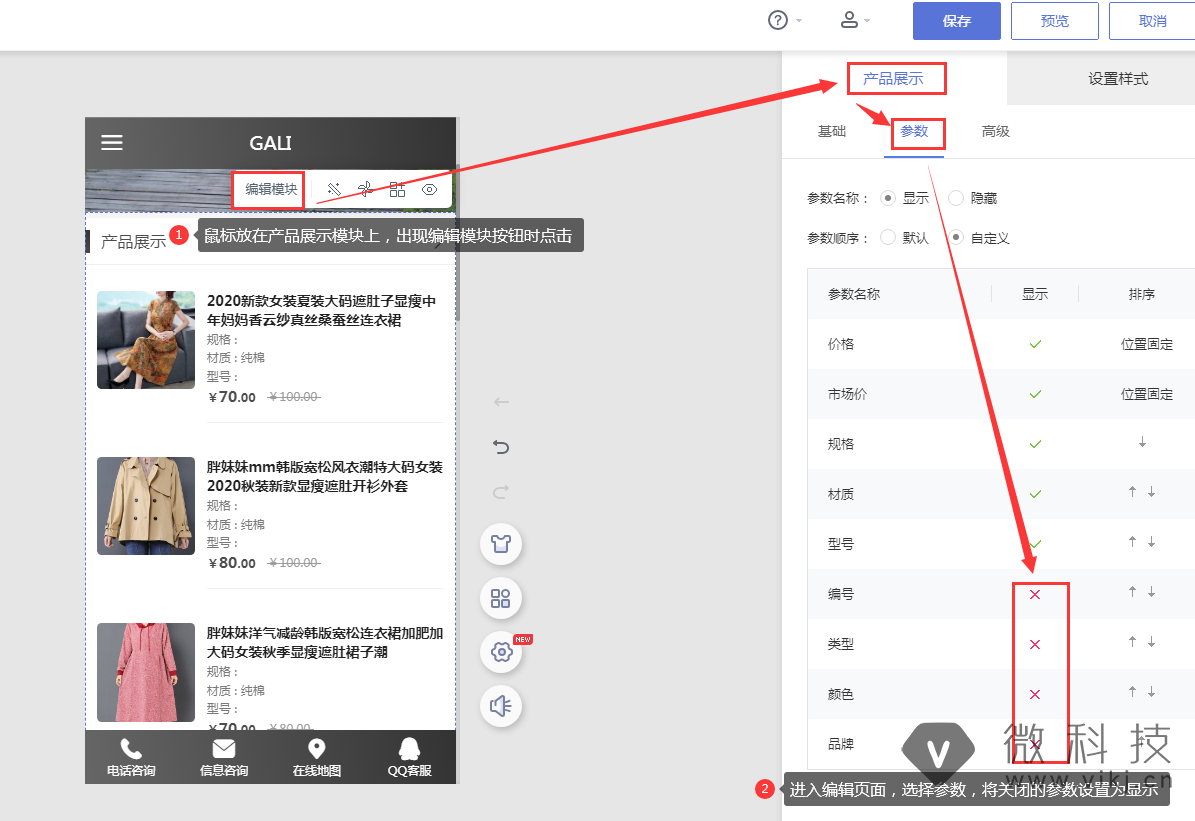 在手机版版设计页面,找出产品展现模块,将鼠标放到模块上,发生【编辑模块】按钮时页面,在【参数】中即将设置表明的产品参数展开页面打开。