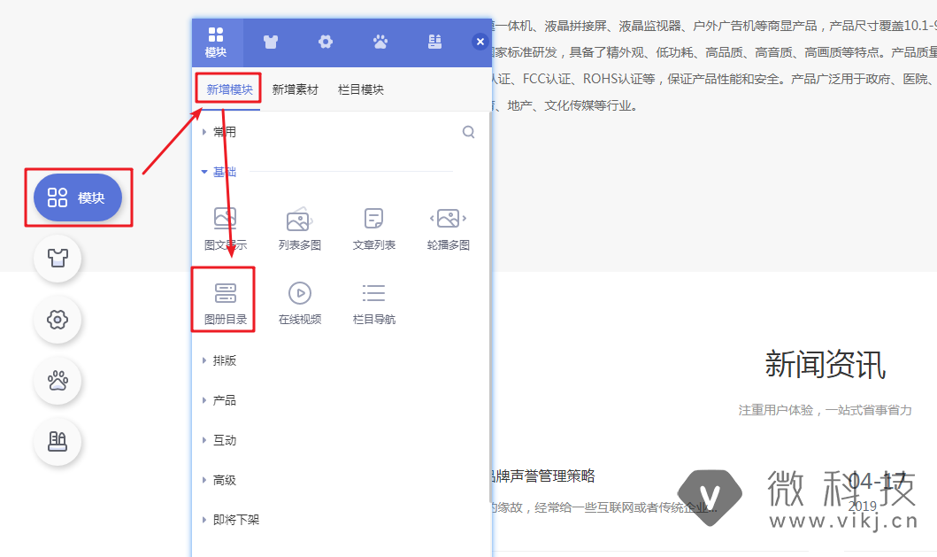 1.1 在电脑网站设计页面点击左侧导航【模块-新增模块】,添加【图册目录】模块。