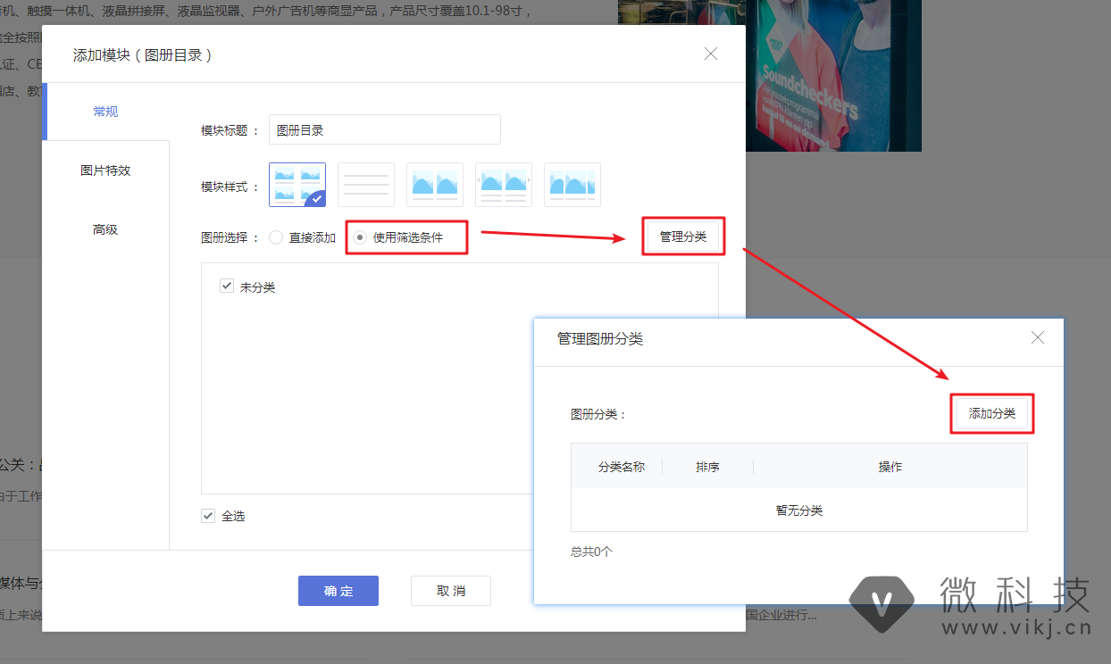 2.2 选择【使用筛选条件】,点击【管理分类】按钮点击进入后可添加新的图册分类,进行分类的排序、删除管理。