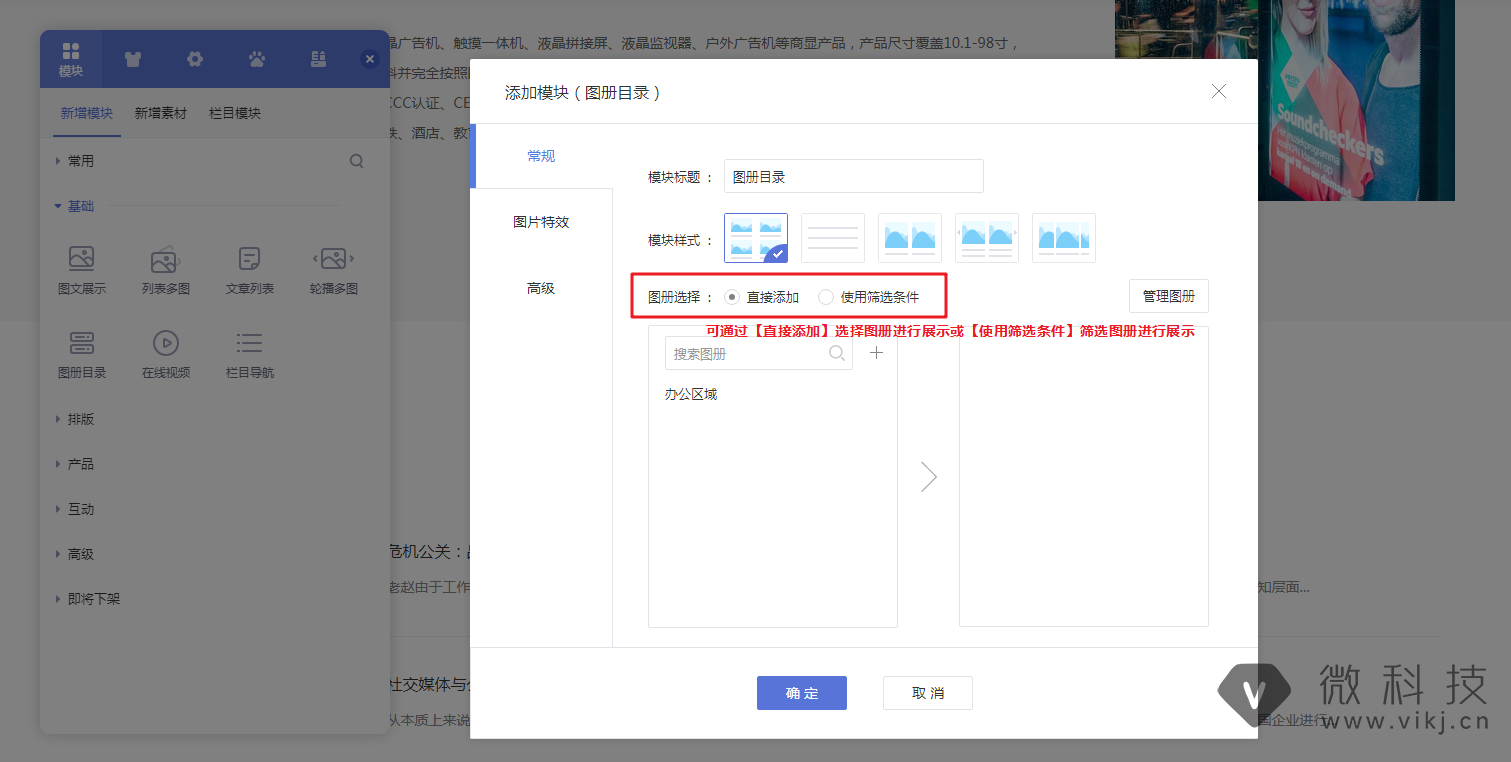 2.1 在右侧弹窗选择需要展示的图册,可通过直接添加选择图册或通过使用筛选条件选择图册。