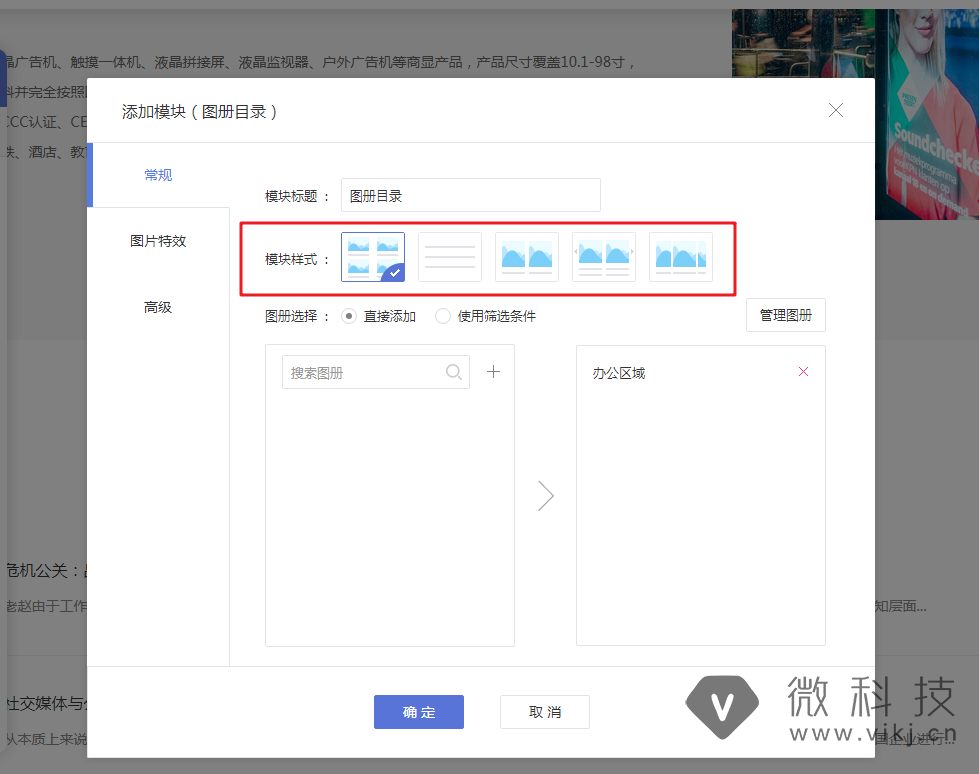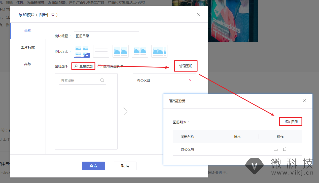 2.3 选择【直接添加】,点击【管理图册】按钮点击可进入添加新的图册,进行图册编辑、排序或删除管理。