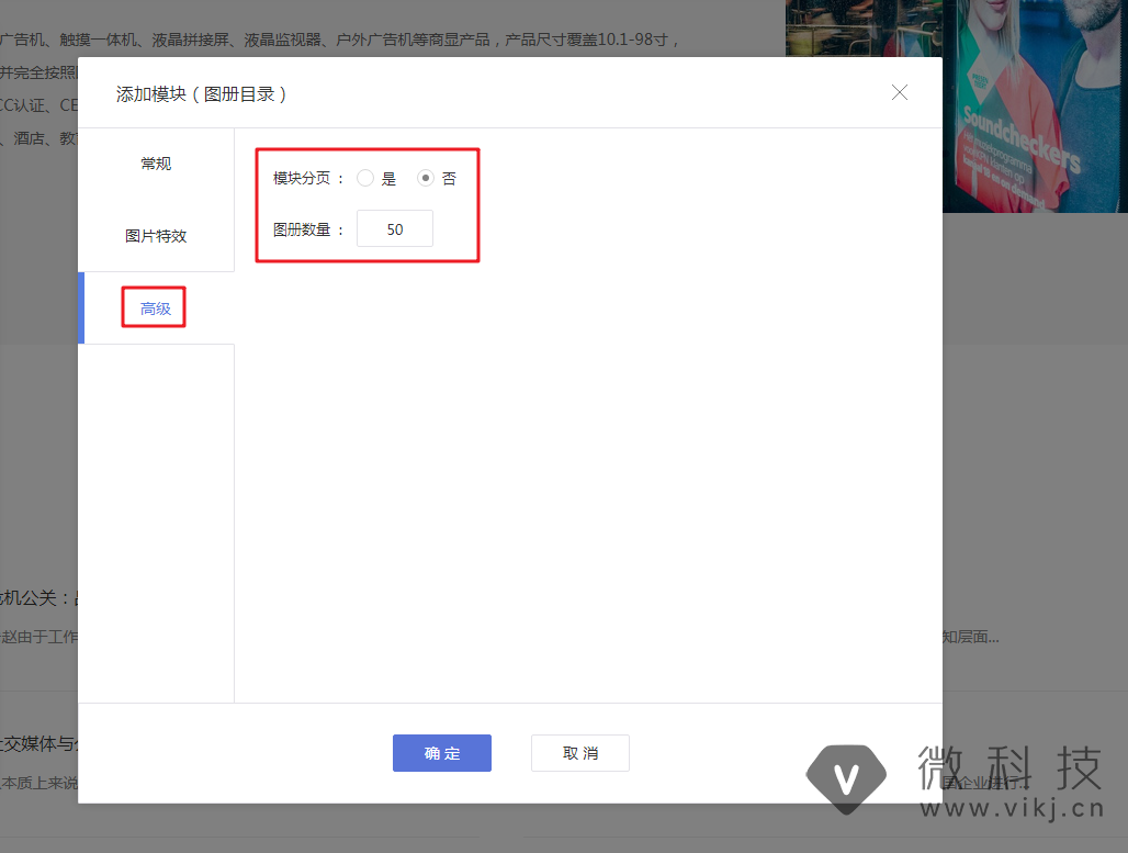 4.1 在图册编辑弹窗点击【高级】,可设置分页显示或隐藏,以及显示的图册数量。