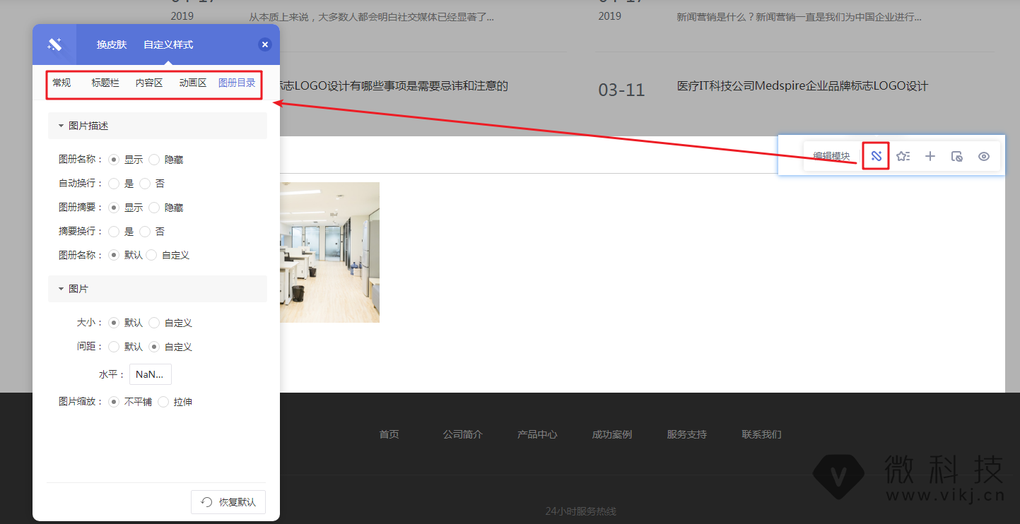 1.1 鼠标移动至模块中,点击【设置样式】可自定义模块样式。包括常规、标题栏、内容区、动画区等。
