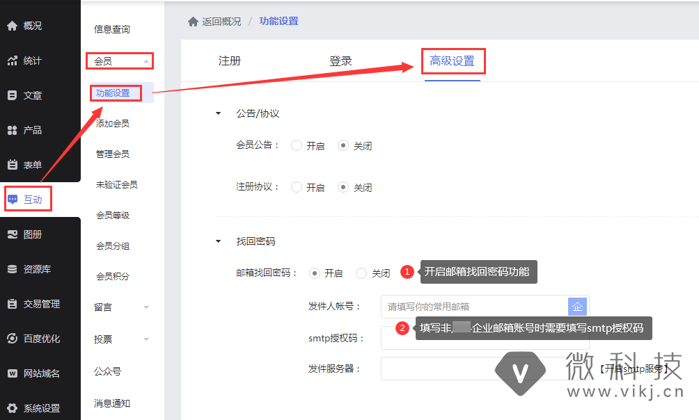 在【互动-会员-功能设置-高级设置-找回密码】中开启【邮箱找回密码】且填写非企业邮箱账号(例如qq、163邮箱等等)均需要填写smtp授权码。