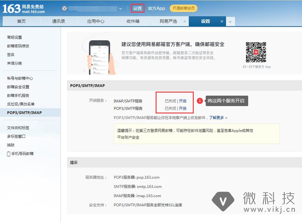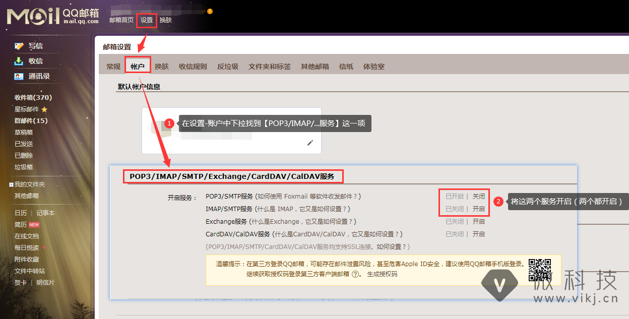 在【设置-账号】中找到【POP3/IMAP/SMTP/Exchange/CardDAV/CalDAV服务】,开启“POP3/SMTP服务”和“IMAP/SMTP服务”(两个都需要开启)。