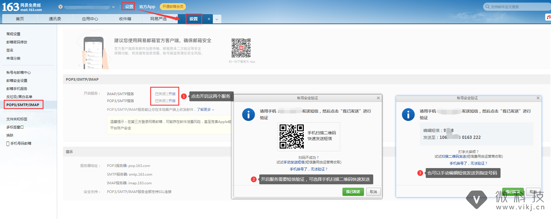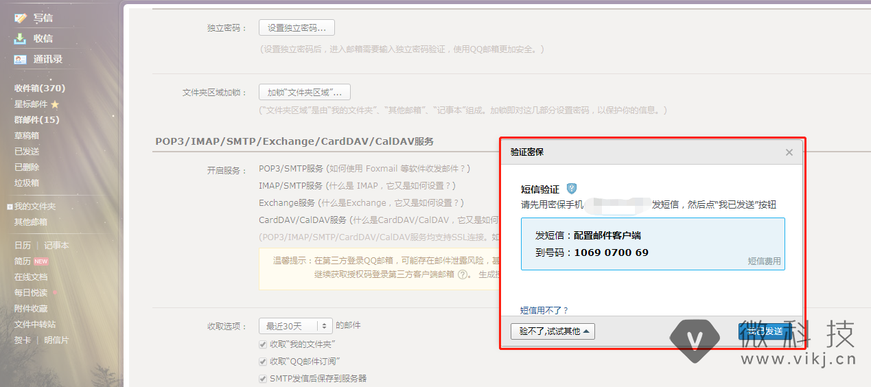 4.3 开启“POP3/SMTP服务”和“IMAP/SMTP服务”需要短信验证(两个服务都需要验证),验证完成点击【我已发送】。